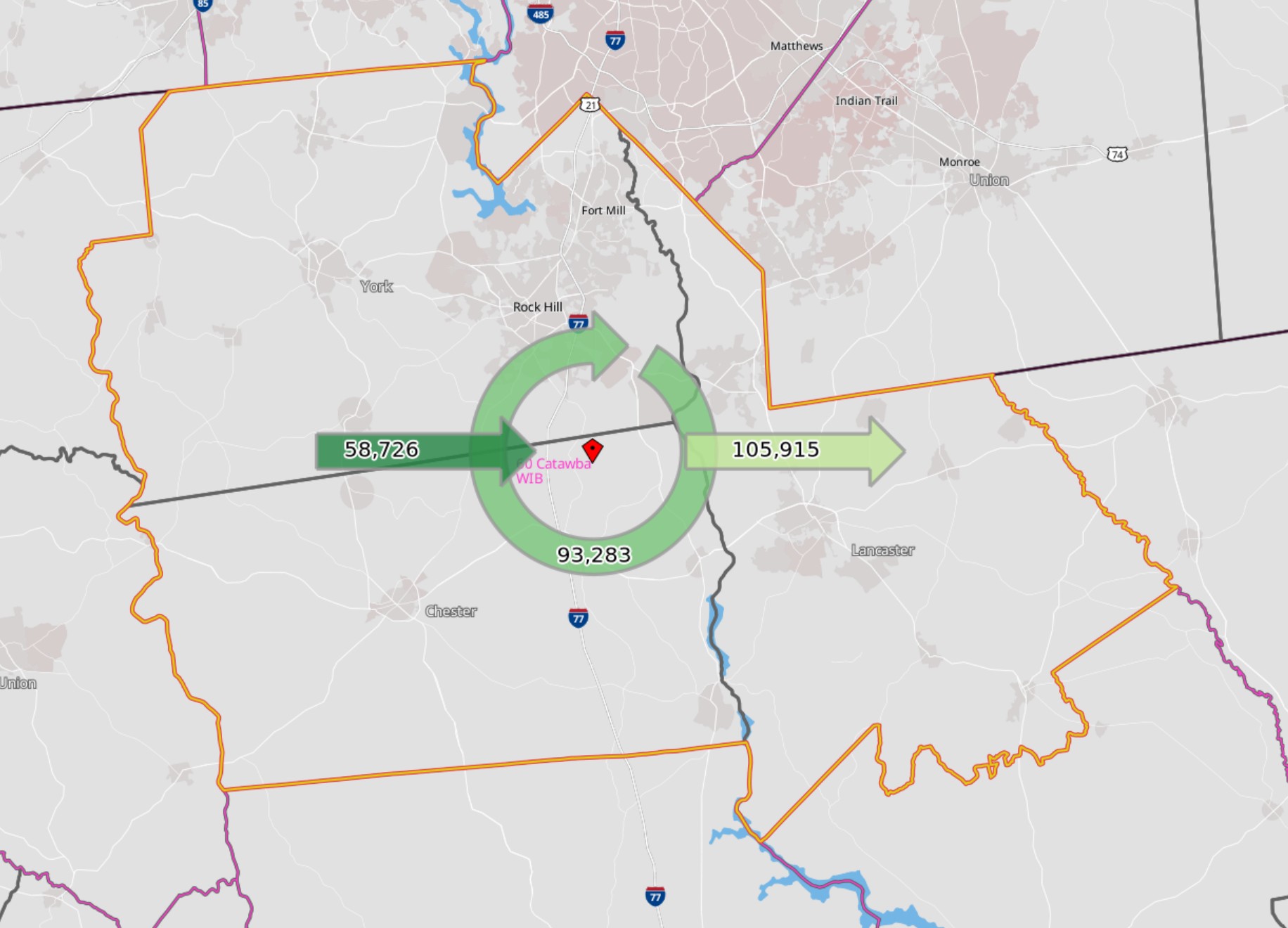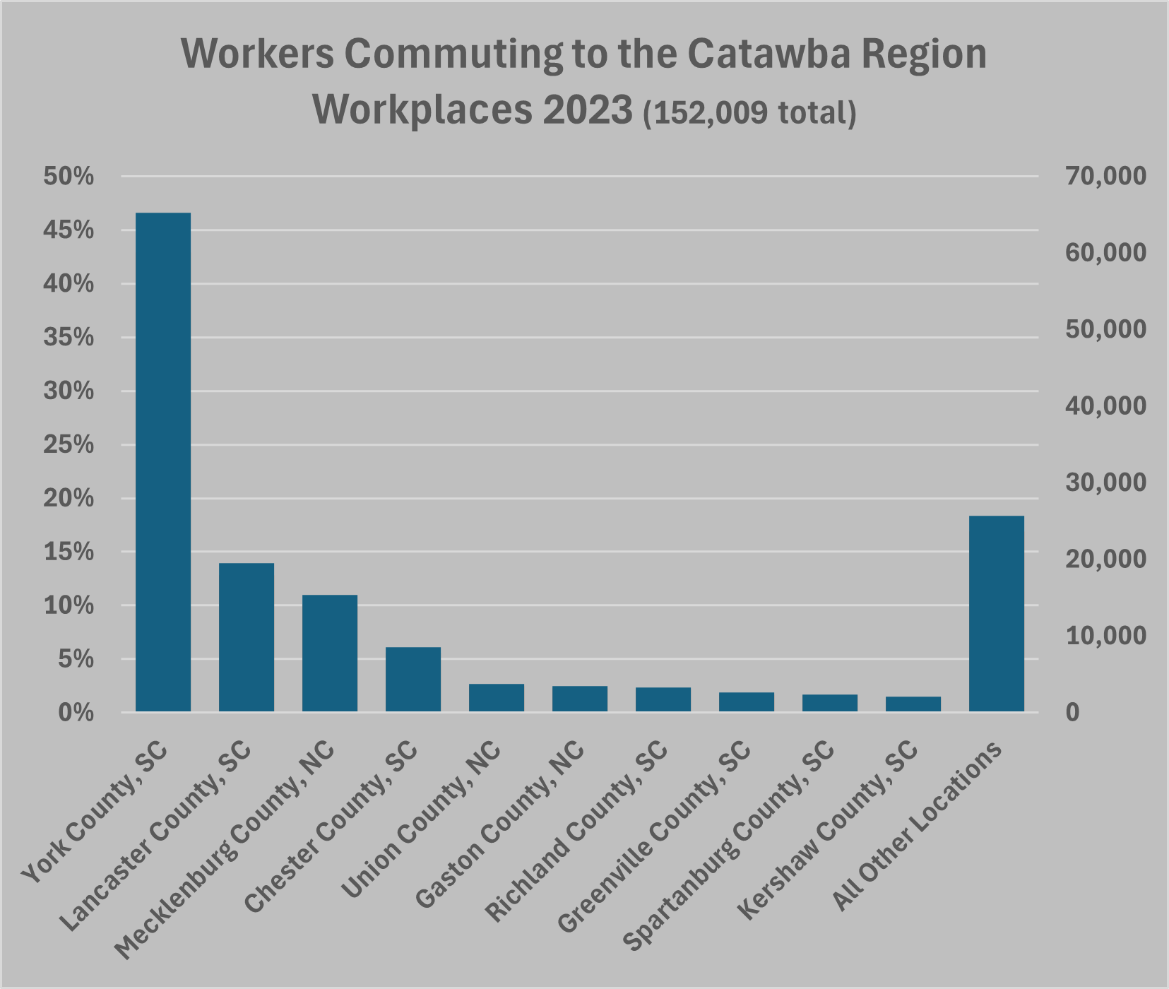 For those individuals living or working within the counties of York, Chester, and Lancaster in 2023, there were individuals who both worked and lived within those SC counties, 105,915 who lived in York, Chester, or Lancaster County and commuted out for their primary job, and 58,726 who lived outside these counties yet commuted in for their primary job.